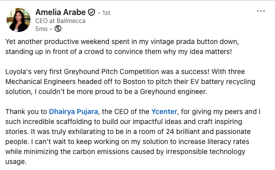 Ycenter x Loyola University hosted a 2-day workshop to take students from Idea to Pitch and prepare them for regional and national pitch competitions. One of the top startup ideas from this event, went on to compete for a Million Dollar prize at Hult B Plan competition.